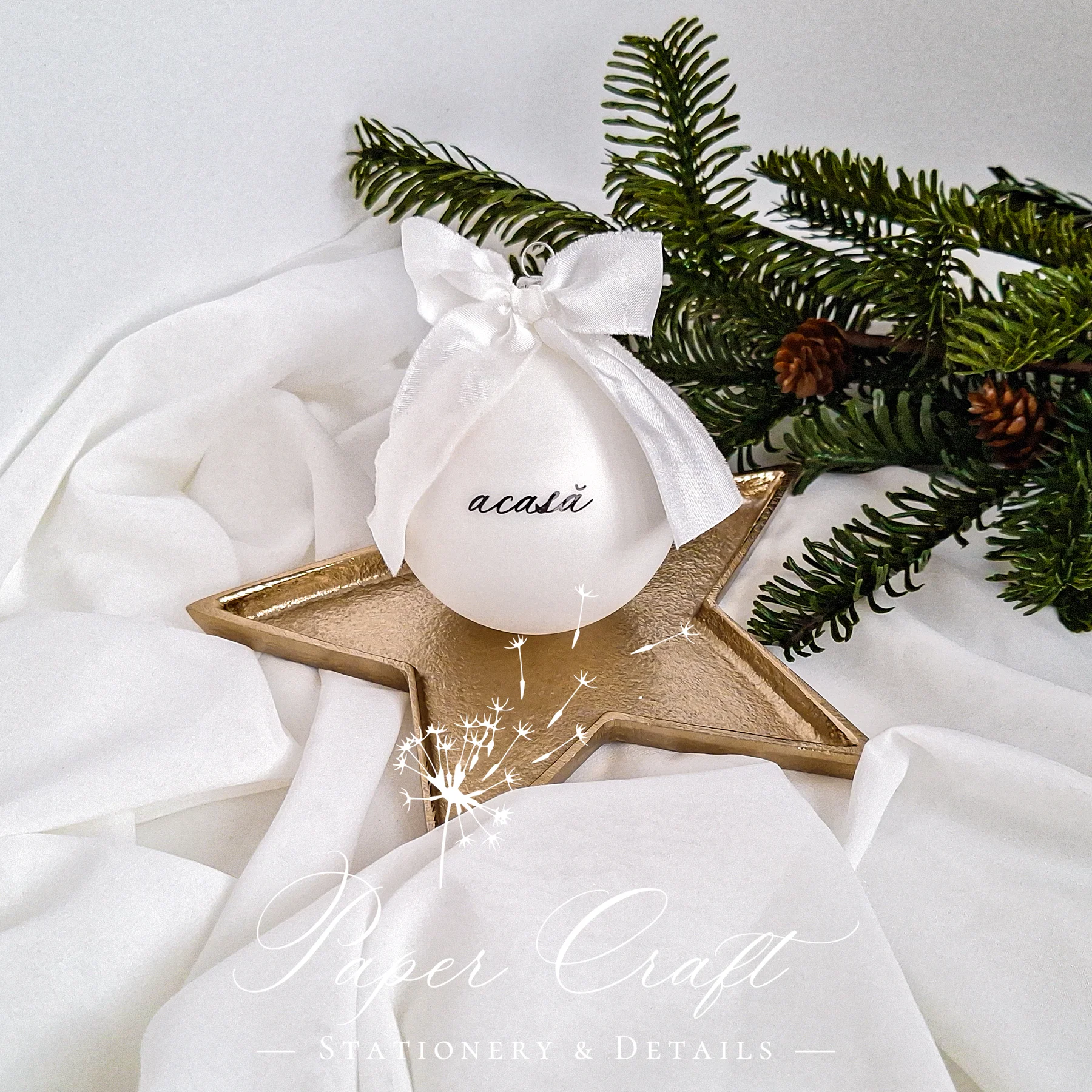 Adaugă un sentiment cald și familiar decorului tău de sărbători cu globul de Crăciun „Acasă”, realizat din sticlă vopsită alb mat și personalizat manual cu un mesaj care inspiră liniște, confort și apartenență. Este alegerea ideală pentru cei care iubesc să-și transforme bradul într-un spațiu plin de emoție și poveste.