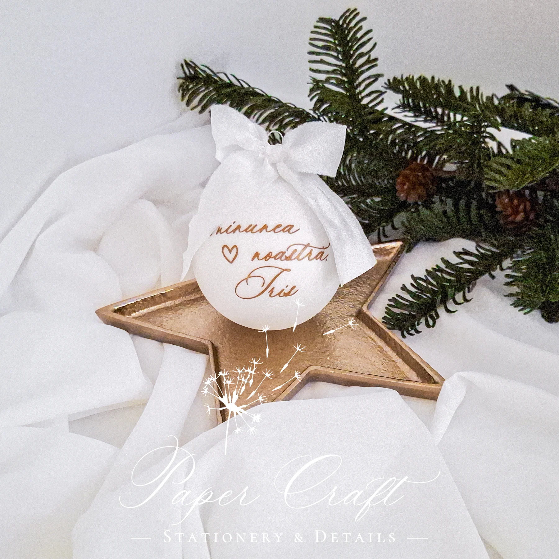 Cu un diametru de 8 cm și un finisaj elegant, suprafața albă mată pune în valoare textul delicat și face ca acest glob să fie potrivit atât ca piesă decorativă, cât și ca mic cadou simbolic pentru cei dragi. Poți alege culoarea panglicii și nuanța textului, astfel încât globul să se integreze perfect în tema ta de Crăciun: clasică, minimalistă sau modernă.