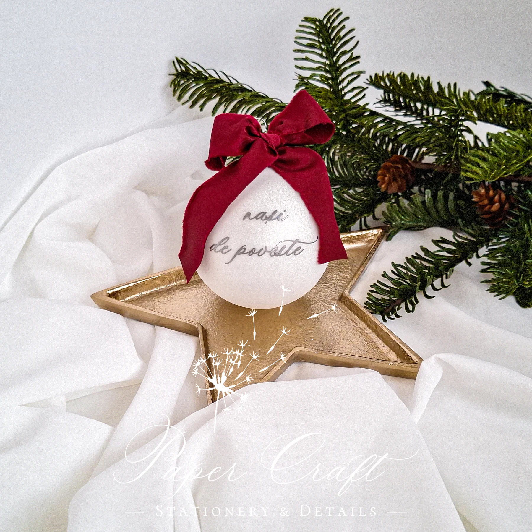 Adaugă un strop de emoție bradului de Crăciun cu globul „Nași de poveste”, creat pentru a celebra legătura specială dintre fini și nași. Realizat din sticlă vopsită alb mat și personalizat manual, globul transmite un mesaj cald și elegant, perfect pentru a fi oferit în dar celor care ocupă un loc aparte în viața voastră.