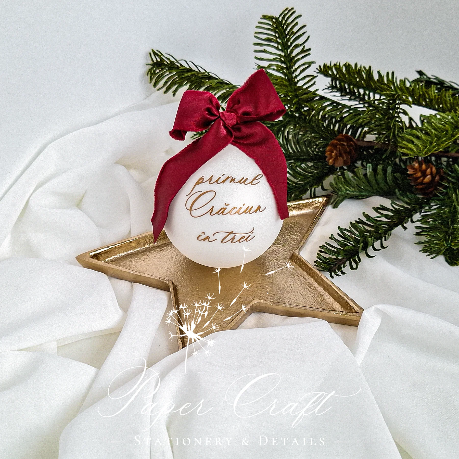 Celebrează un moment unic în viața familiei tale cu globul de Crăciun „Primul Crăciun în trei”, realizat din sticlă vopsită alb mat și decorat cu un mesaj delicat, plin de emoție. Fiecare glob este lucrat manual, personalizat cu grijă și atenție, astfel încât să devină o amintire prețioasă pentru anii ce vor urma.