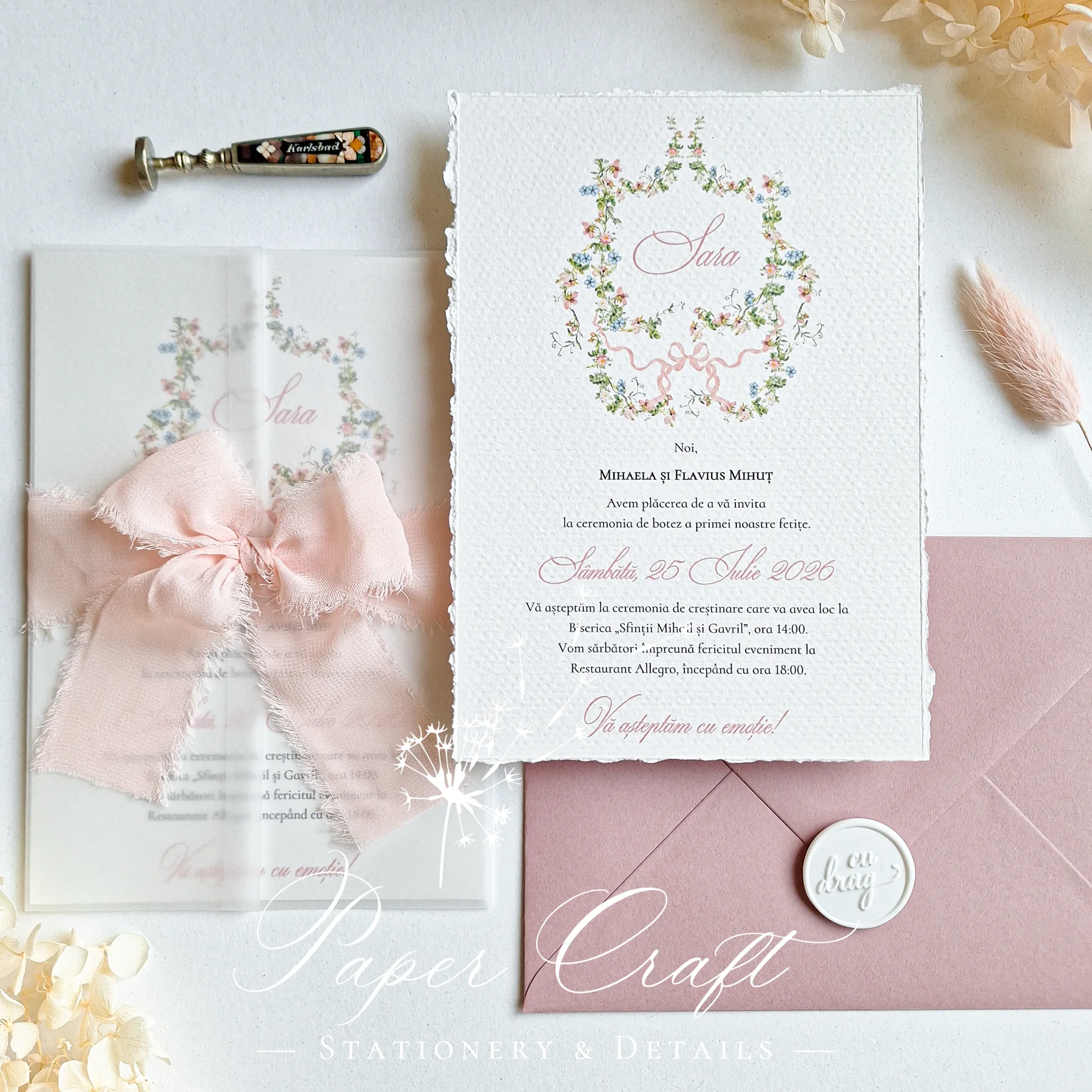 Textul, fonturile și paleta de culori pot fi adaptate la cererea clientului. Pentru a adăuga un plus de rafinament, invitația poate fi accesorizată cu o panglică delicată sau cu un sigiliu de ceară personalizat.