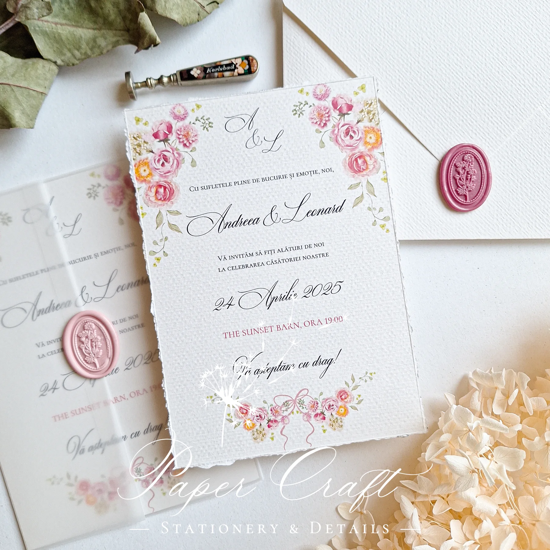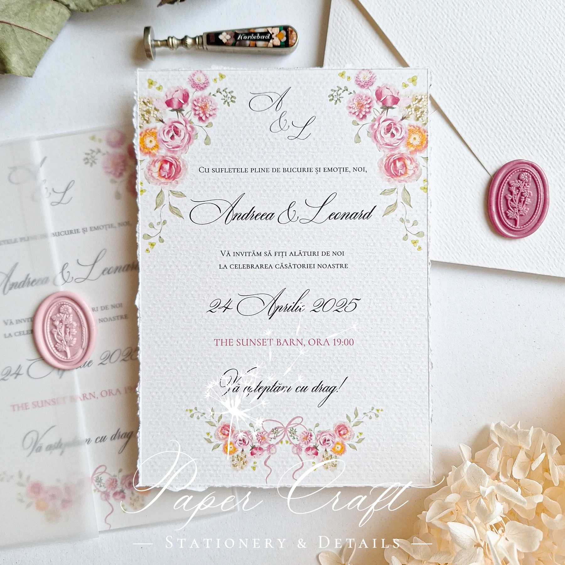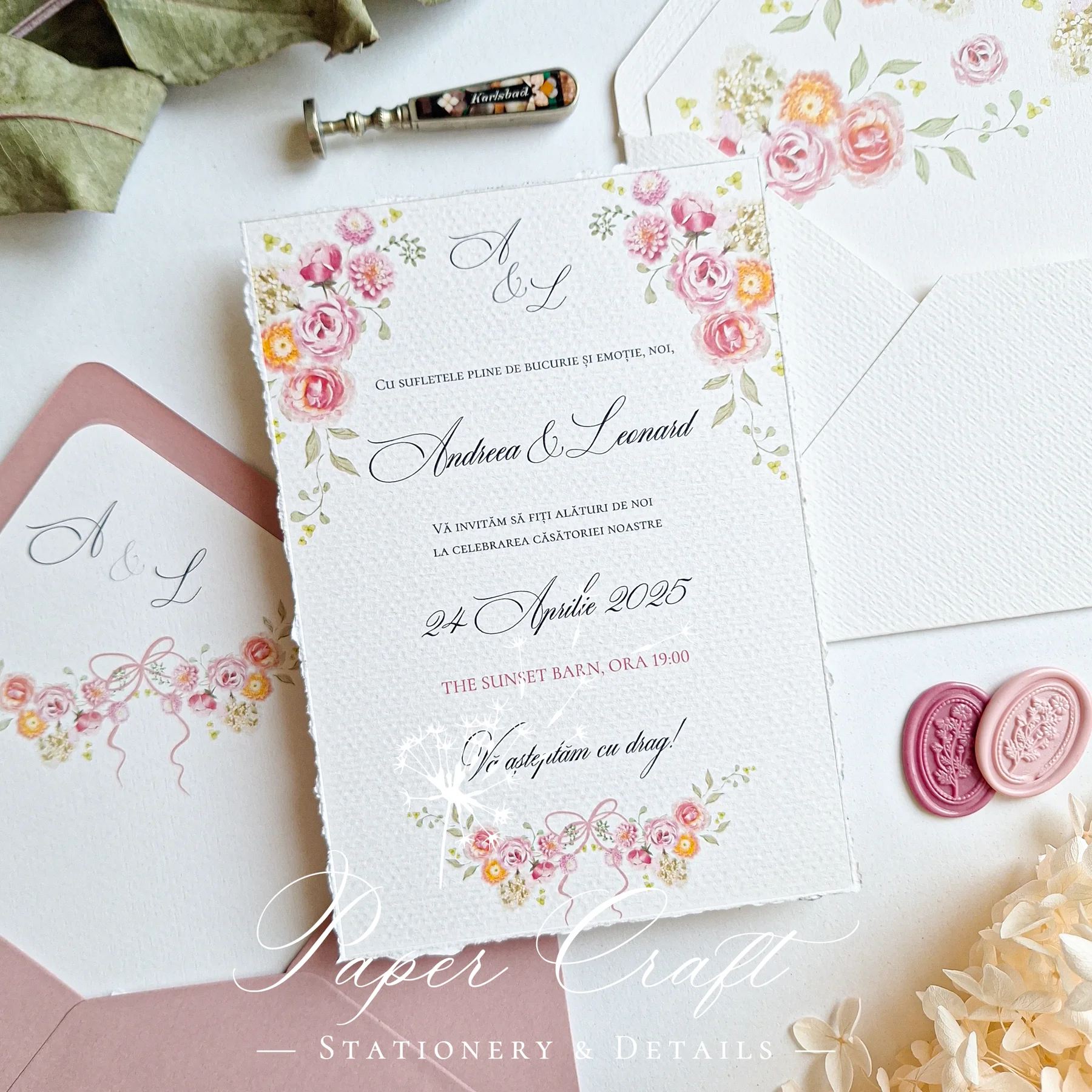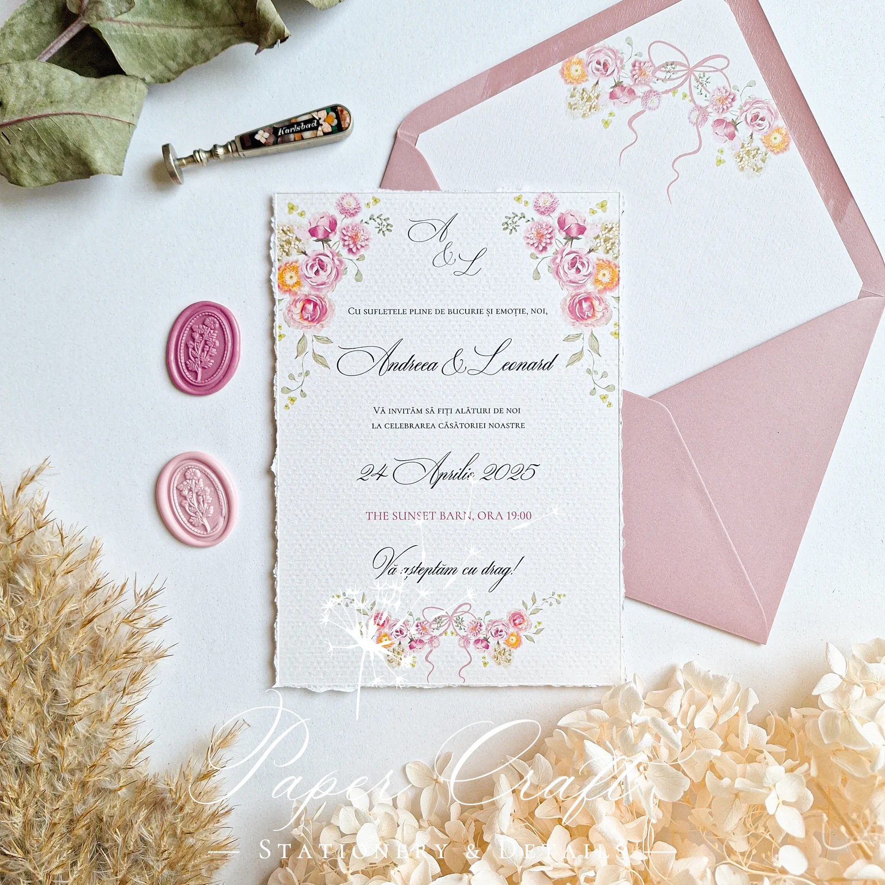 „Blush & Bloom” combină frumusețea florilor roz pastelate cu o fundiță delicată, creând o invitație cu aer romantic și feminin. Designul atent lucrat, cu flori colorate armonios, emană gingășie și eleganță, transformând invitația într-o mică bijuterie ce va fi păstrată cu drag de invitați. Perfectă pentru nunți pline de căldură și rafinament, care pun accent pe detalii pline de farmec.