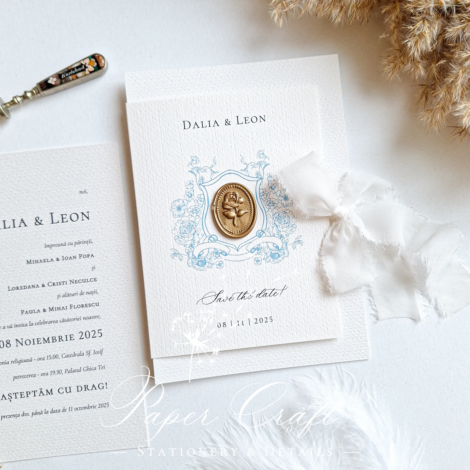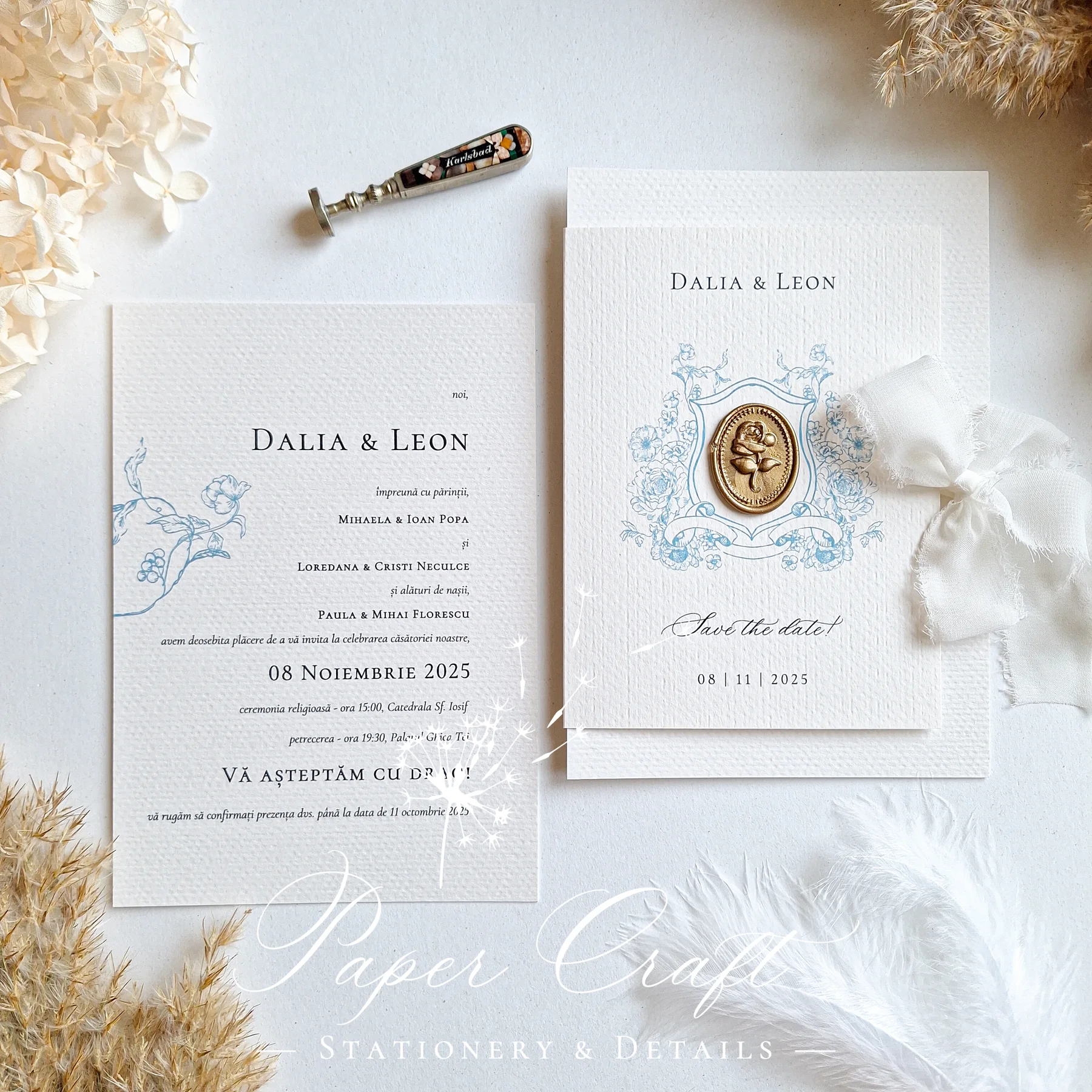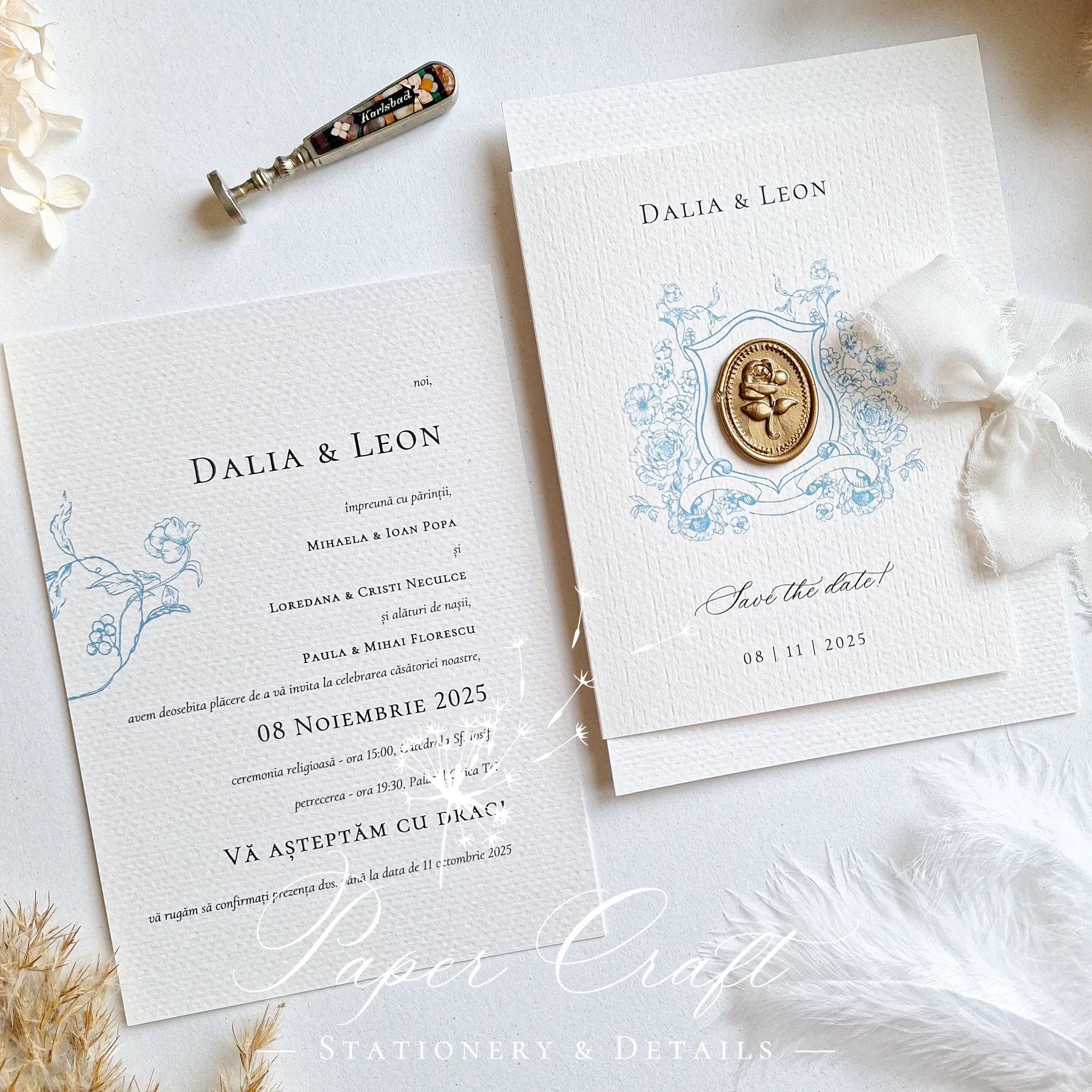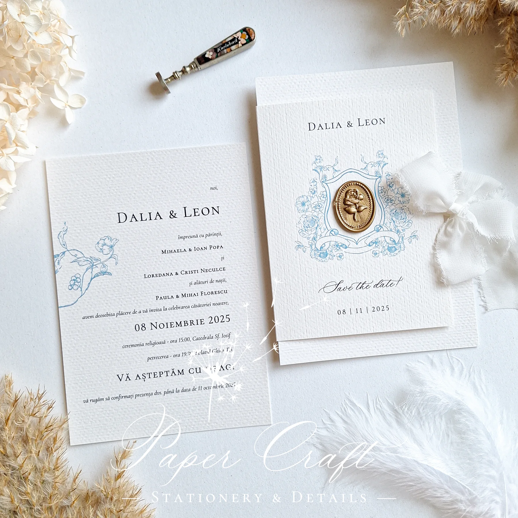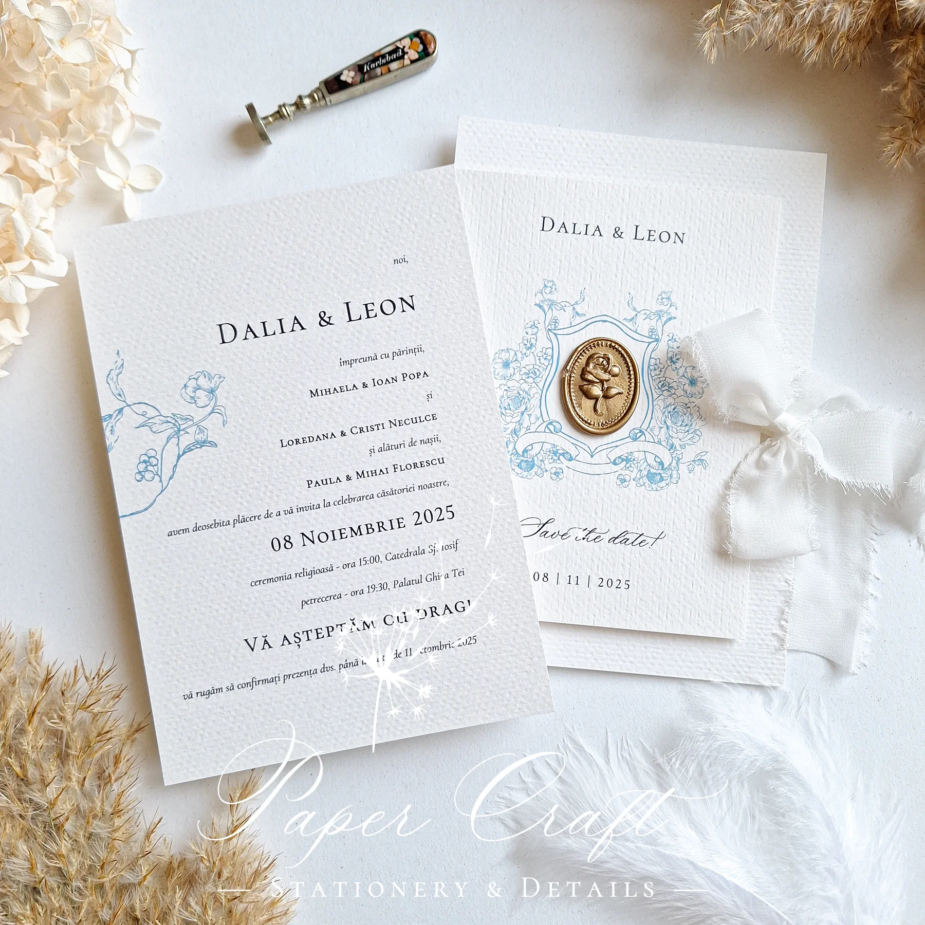 „Ethereal Grace” combină eleganța subtilă cu detalii rafinate: panglică și sigiliu, ramă albastră delicată și o crenguță cu flori albastre. Fiecare element este gândit pentru a crea o atmosferă aerisită, sofisticată și romantică. Este invitația ideală pentru cuplurile care apreciază designul clasic, cu accente elegante și culoare fină, perfectă pentru o nuntă de poveste.