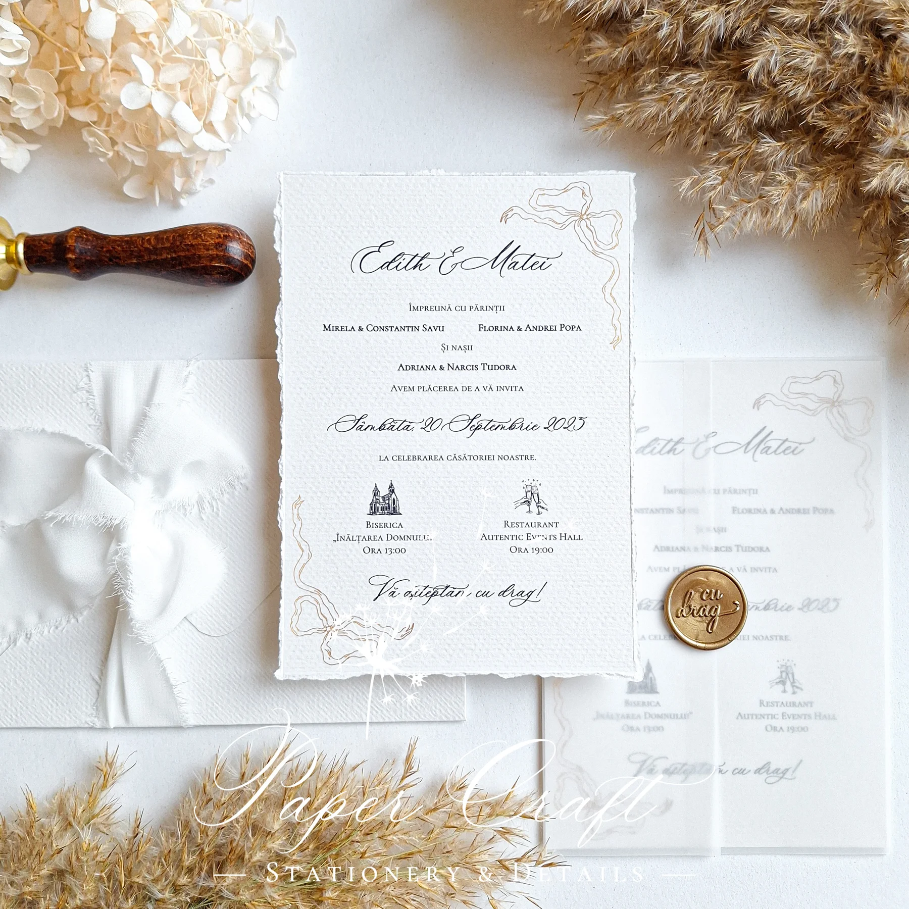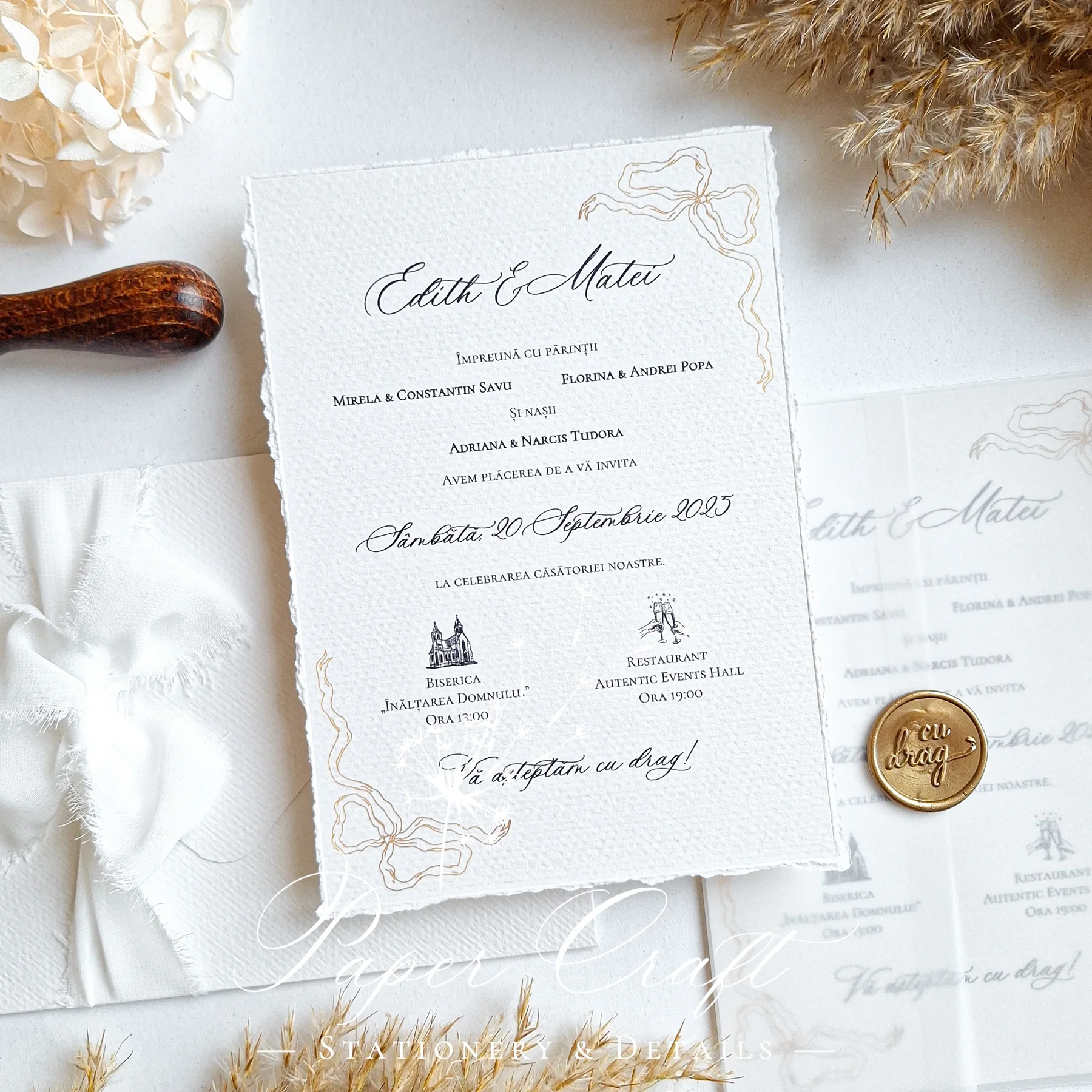 Invitația de nuntă „Golden Ribbons” impresionează prin simplitatea sa elegantă și detaliile rafinate. Designul minimalist este pus în valoare de cele două fundițe aurii așezate în colțuri, care adaugă o notă de strălucire discretă. Este alegerea ideală pentru cuplurile care apreciază un stil clasic, dar cu accente sofisticate.