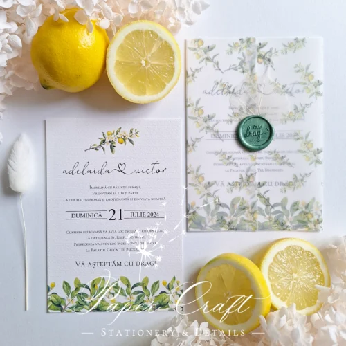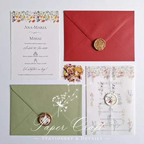 În prețul afișat sunt incluse și următoarele elemente: sigiliul de ceară de pe invitație, inelul auriu, inițialele de pe plic, tipărirea și asamblarea.