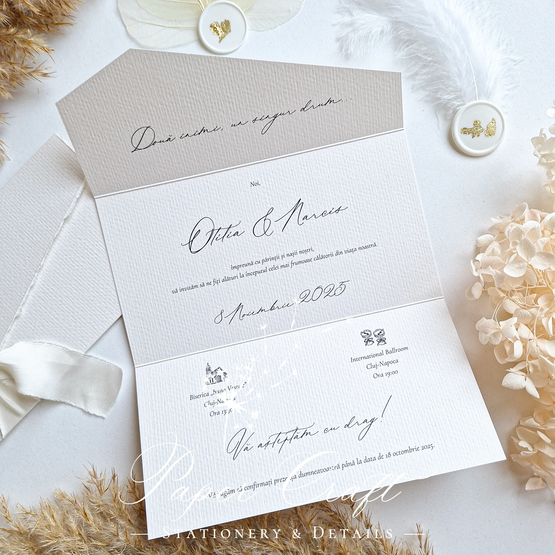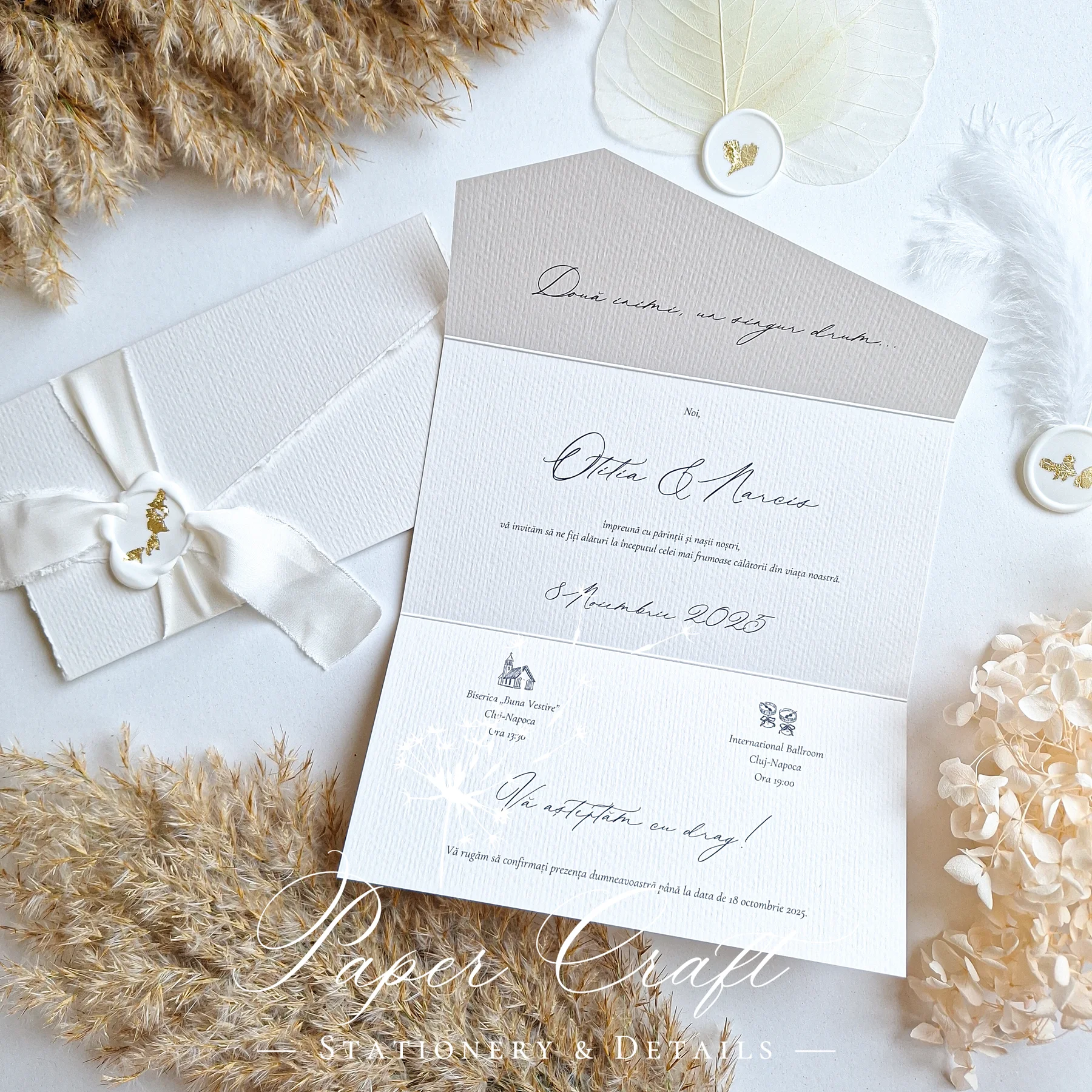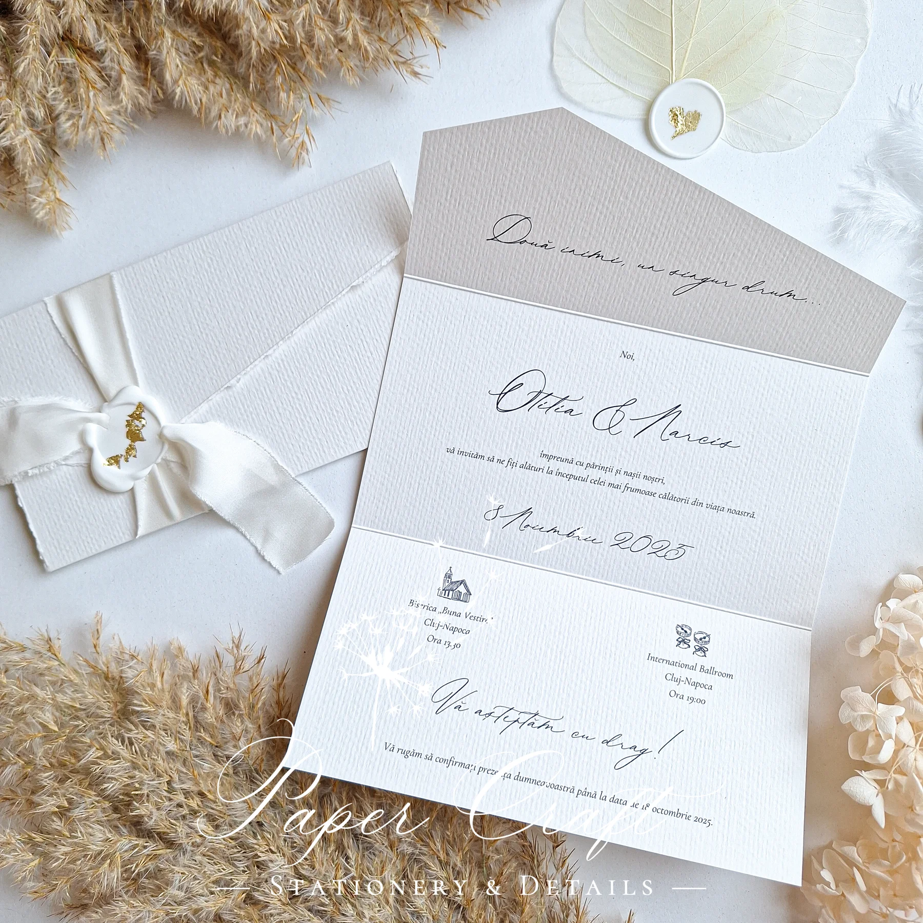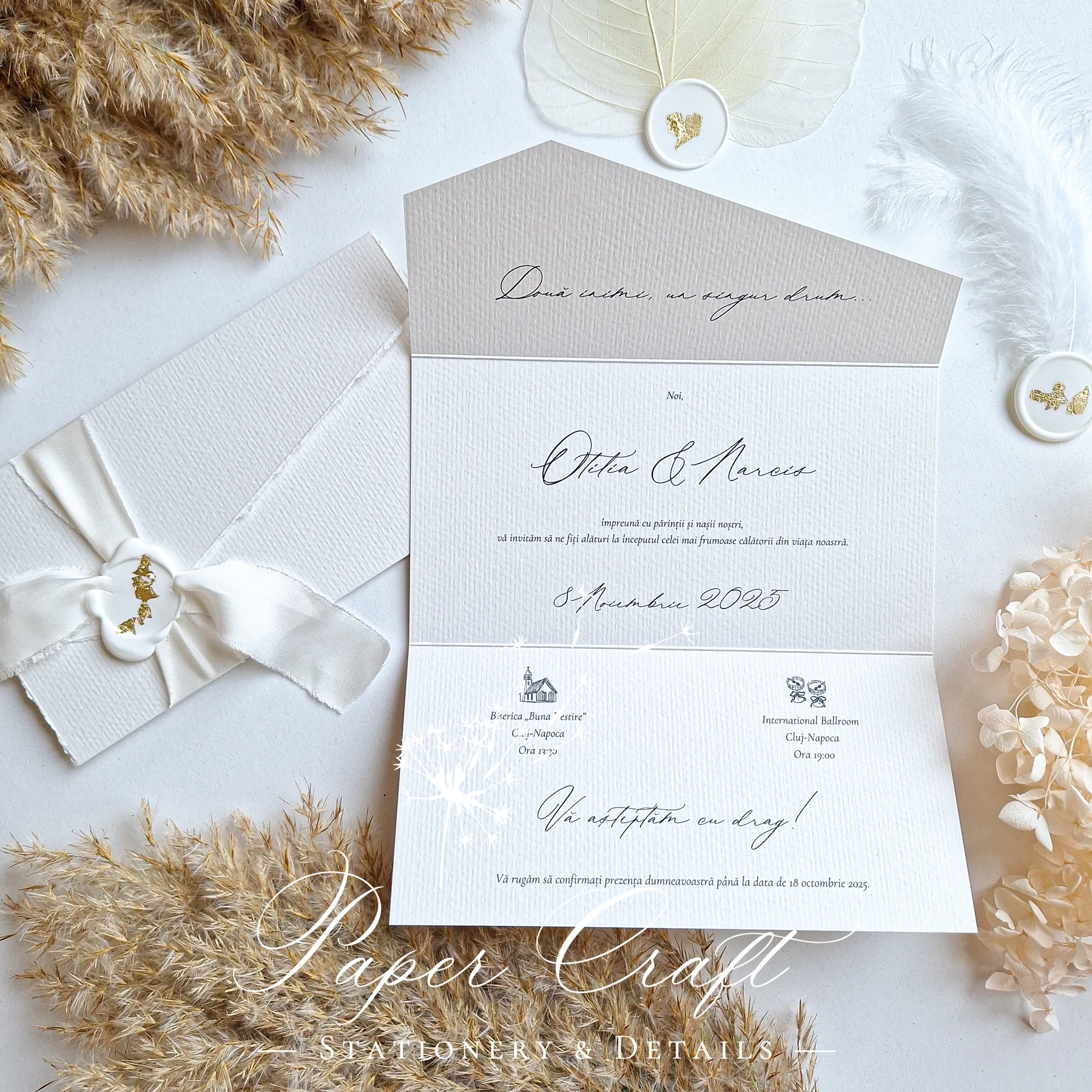 „Natural Harmony” este o invitație pliată în trei, cu mult alb și accente aurii fine, sigiliu de ceară și o panglică cu margini nefinisate. Designul emană eleganță și rafinament, combinând minimalismul cu detalii atent lucrate. Ideală pentru nunți clasice, sofisticate și cu un strop de originalitate în detalii.