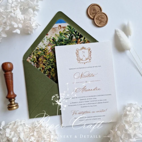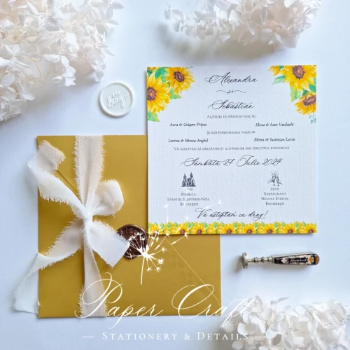 Cu un farmec aparte, invitația noastră de nuntă se remarcă prin prezența uneia dintre cele mai frumoase flori. Aceasta a fost creată cu minunata Floarea-Soarelui, aceasta aducând un strop de sofisticare și prospețime, anticipând o ceremonie plină de stil și distincție, sub semnul unei iubiri ce strălucește în fiecare detaliu.