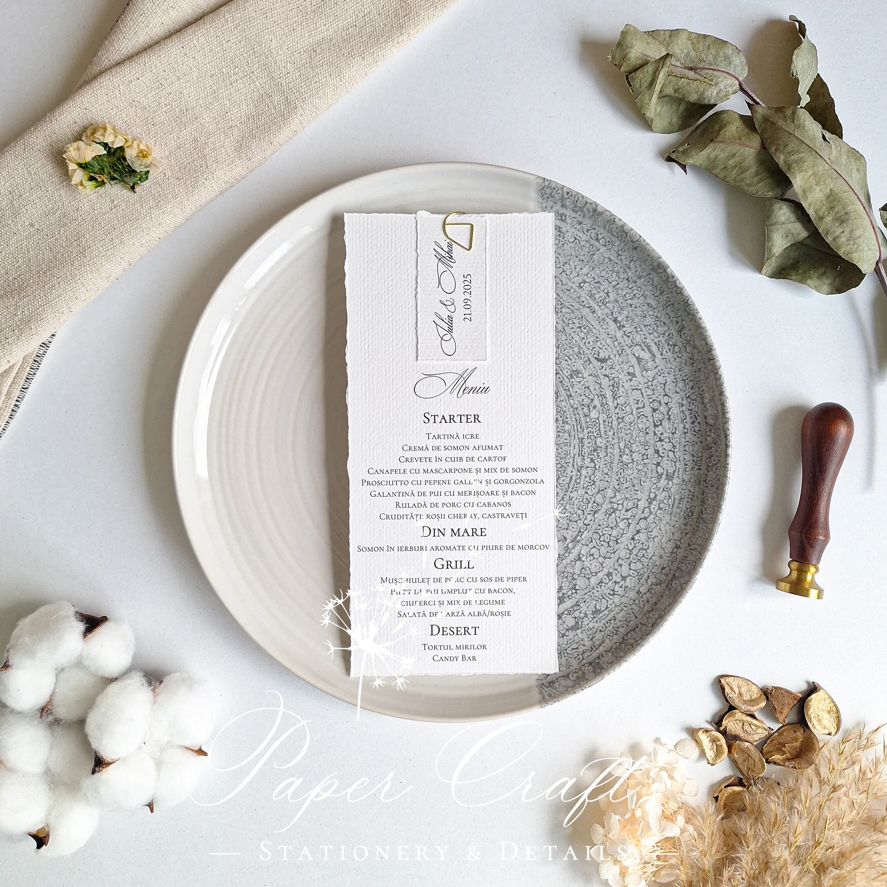 Este accesorizat cu un tag decorativ, ce poate fi personalizat cu inițiale, data evenimentului, un mesaj scurt sau alt text dorit. Meniul este imprimat pe carton de calitate și adaptat complet tematicii alese.