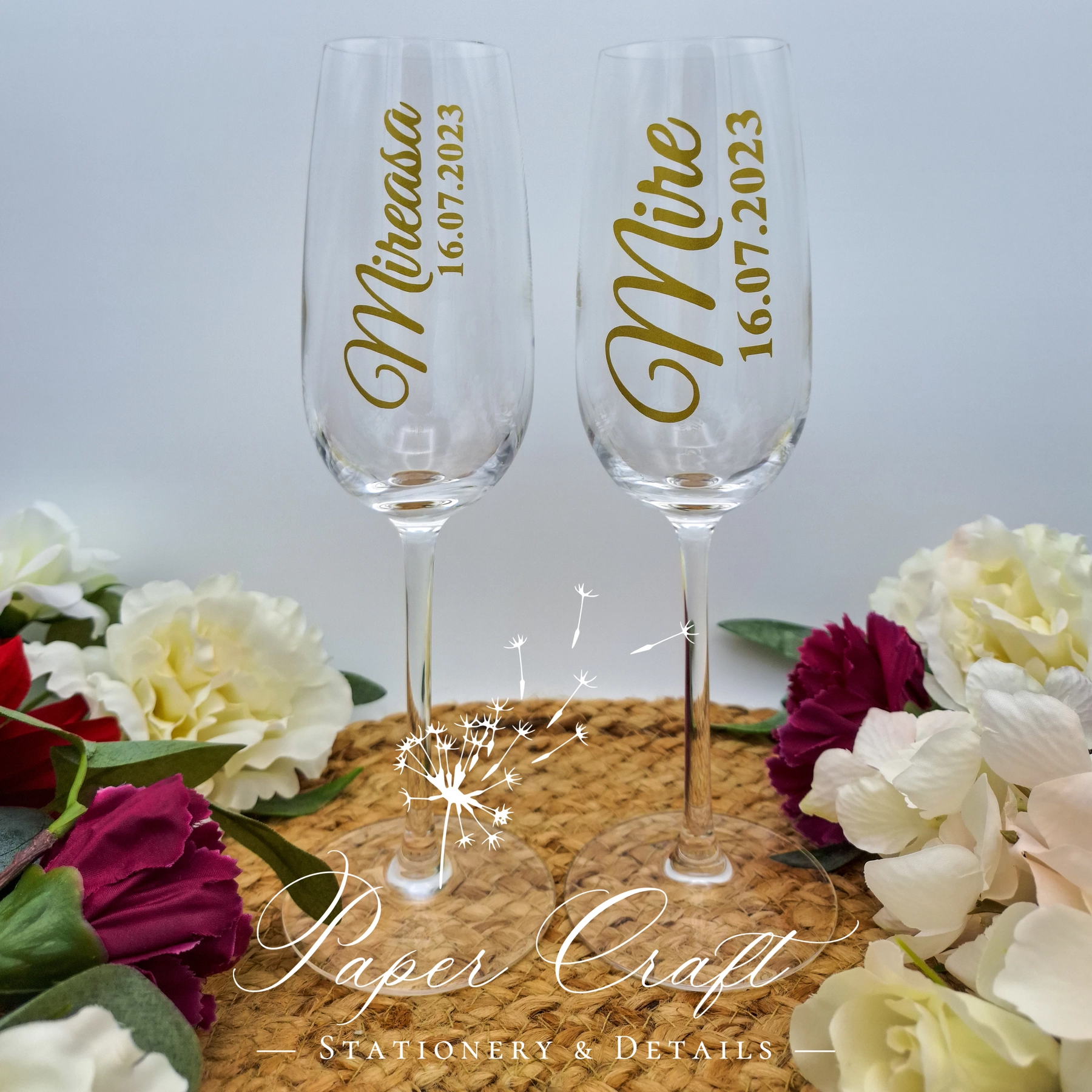 Paharele personalizate pentru nuntă sunt accesorii elegante, create special pentru a celebra momentul tău unic. Prin adăugarea de detalii personalizate precum numele mirilor, numele nașilor, data evenimentului și nu numai, ele capătă un farmec deosebit și devin o amintire memorabilă a evenimentului tău.