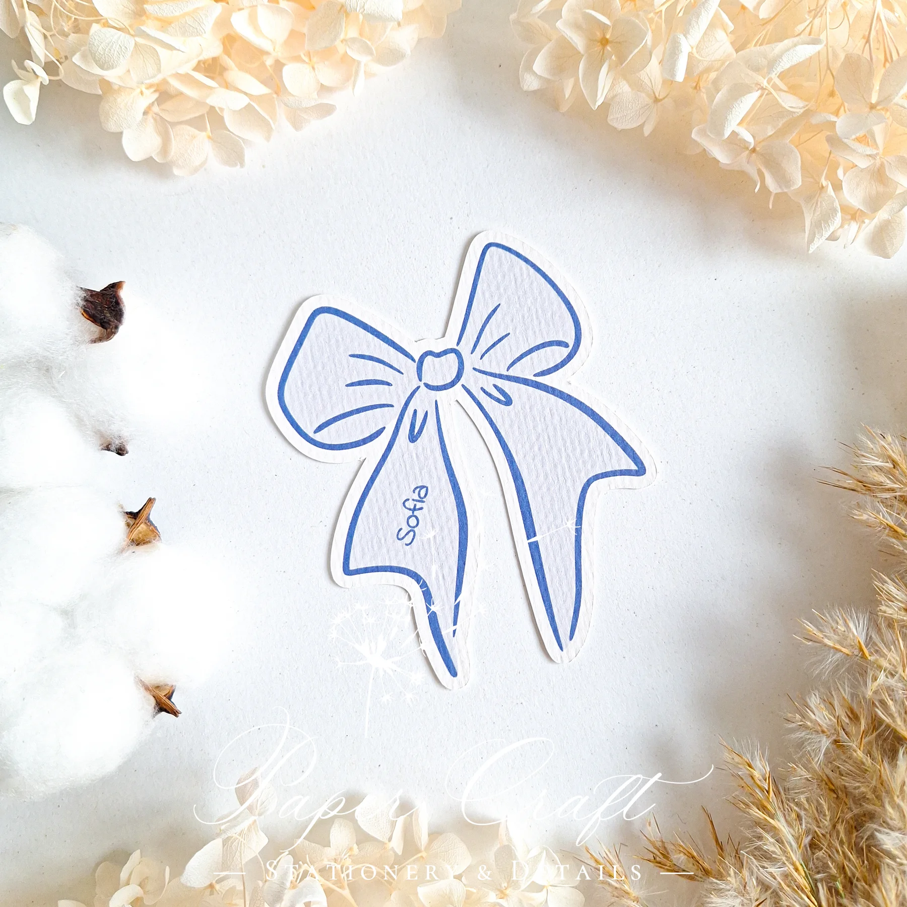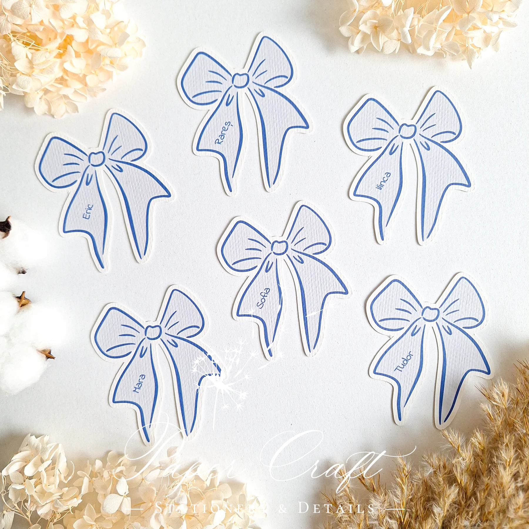 Place card în formă de fundiță albastră, cu un design simplu și elegant, potrivit pentru evenimente cu tematică delicată.