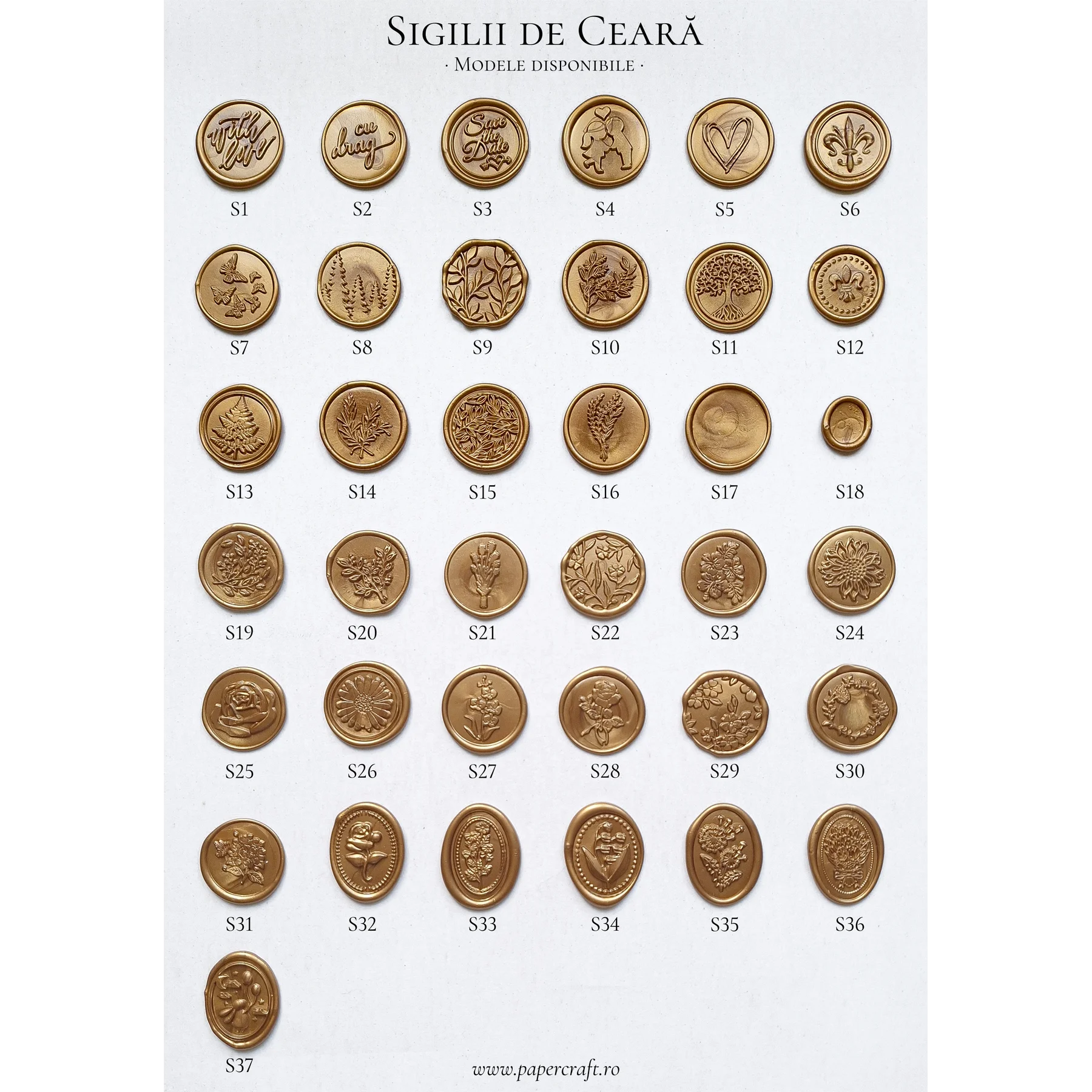 Pentru a vizualiza culorile disponibile, vă rugăm să vizitați categoria de sigilii de ceară simple.