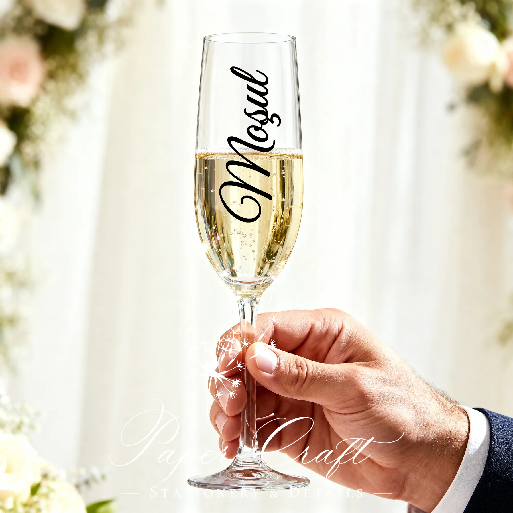 Stickerele cu text standard (de exemplu „Mireasă”, „Mire” sau alte variante similare) se realizează direct în culoarea aleasă, fără transmiterea unui model digital în prealabil.